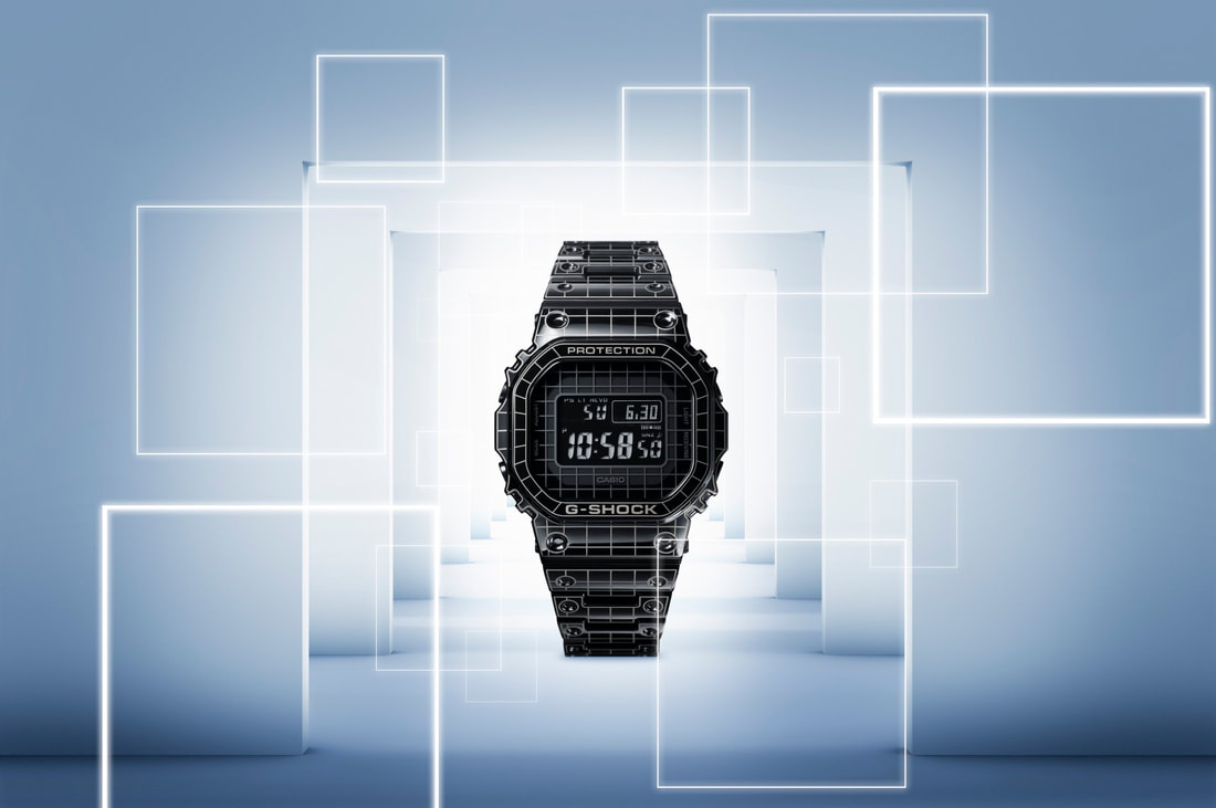 The GMW-B5000 is an epoch-making series boasting an evolved exterior with full metal construction of all outer parts. The main features are a grid design in the image of a time tunnel that connects the past with the future. A “near-future” design with prominent silver lines was forged by applying black ion plating finish to the bezel, band and buckle surface, while bringing out an underlying color scheme using a laser to carve out the latticed pattern.