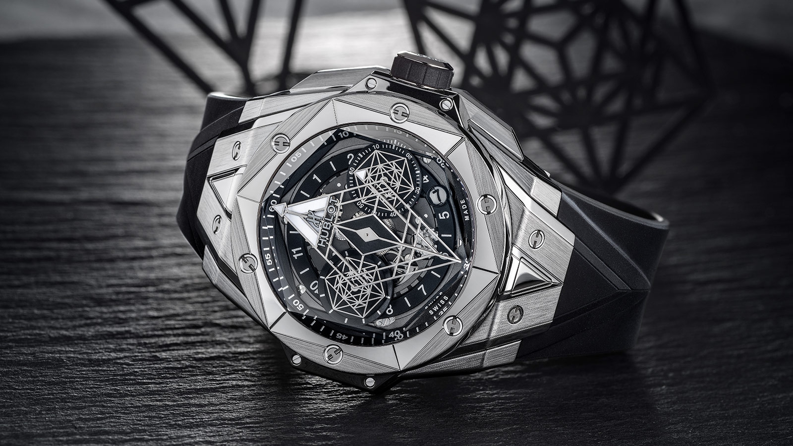 The motif spans the case, cutting into its hexagonal bezel, and carving into the sapphire crystal, juxtaposed against the hands with their geometric lines, and moulded onto the interchangeable bracelet. The dial plays with transparency, allowing glimpses of the Unico movement. It is feat of construction, almost architectural in scope, in a 45-mm case. the HUB1240 Unico manufacture self-winding chronograph movement: the chronograph seconds are tracked along a straight hand, whilst the chronograph minutes complete their laps on one of the two discs on the dial. It oscillates at a frequency of 28,800 vibrations per hour, for a period of 72 hours.