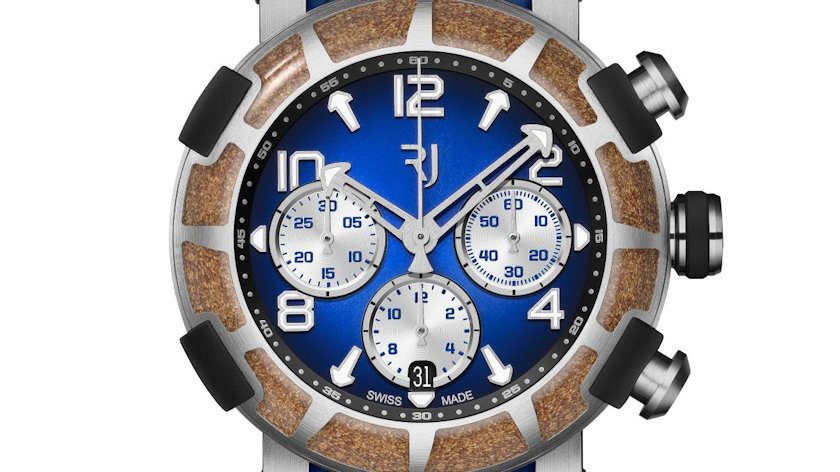 To get the color of the sea as well as the legendary Mykonos,the dial is sun brushed ,then galvanized,gradient painted and finally coated with transparent lacquer.The chronograph counters have been rhodium-plated to coordinate with the arrow-shaped, satin-finished hands, so that the limited-editions remain faithful to the ARRAW Marine family. Every ARRAW Marine Mykonos special edition case is crafted in grade 5 titanium and comes adorned with the signature rubber RJ Bumpers™ that define the ARRAW collection. The unique composite bezel combines sand with a high-performance resin created in-house by RJ. The unique sand-infused bezel is secured to the case with a metal grid whose shape alludes to the iconic windmills of Mykonos.
