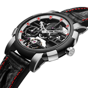 Painted in cold enamel, the red skulls indicate the hours.The inclination of the internal bezel gives a certain perspective and leads the eyes towards the vital organ of the watch, the skeleton movement. This manual winding movement built on 3 levels was designed by RJ and allows to appreciate the mechanics, with the small seconds at 9 o’clock, the barrel at 12 o’clock, and the balance wheel at 6 o’clock shown on the dial side. A crocodile hornback strap completes this exclusive model with red stitching to recall the color of life flowing through the vein.